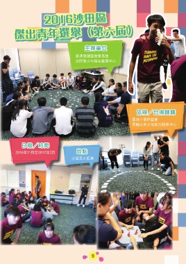 2016沙田區 傑出青年選舉(第六屆) 主辦單位 香港傷健協會賽馬會 沙田青少年綜合服務中心 協辦/合辦機構 香港小童群益會 馬鞍山青少年綜合服務中心 日期/時間 2016年11月至2017年2月 地點 沙田及土瓜灣 9