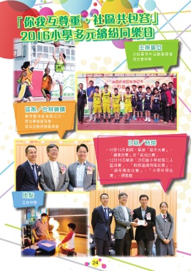 「你我互尊重,社區共包容」 2016小學多元繽紛同樂日 主辦單位 沙田區青年活動委員會 及五育中學 協辦/合辦機構 會德豐地產有限公司、 青年事務委員會、 青年活動統籌委員會 日期/時間 ˙10至12月期間,舉辦「寫作大賽」、 「繪畫比賽」及「航拍比賽」 ˙12月10日舉辦「沙田區小學校際三人 籃球賽」、「校際通識問答比賽」、 「鋼琴獨奏比賽」、「小學科學比 賽」、頒獎禮 地點 五育中學 24
