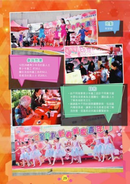 地點 利安邨 參與對象 12至29歲青少年及社區人士 青少年義工 約30人 攤位及招待義工各約50人 長者及社區人士 約200人 目的 ˙由不同背景青少年義工設計不同東方賀 年習俗及美食為主題攤位,讓社區人士 了解各地新年文化。 ˙邀請區內不同的弱勢團體參與,包括區 內獨居長者,讓青少年及長者互相了解 及欣賞,促進長幼共融及慶賀新年。 29