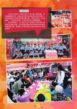 活動成效 30多位本地青少年和南亞青少年作為義工籌備活動,並 透過籌備嘉年華,認識本地及南亞美食和彼此的新年習俗。 同時邀請區內長者及家庭參與嘉年華,向區內社區人士表達 關懷,一同發揮正能量,宣揚社區鄰里互助關愛精神。 嘉年華會當天,近100位來自不同背景及年齡的義工負 責表演及攤位遊戲,部份更探訪獨居長者及親自接送長者到 會場參與活動。期間義工們與參加者交流新年風俗及分享應 節美食。 31