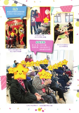 地點 循道衛理楊震社會服務處 沙田青少年綜合發展中心 長者分享心聲, 青少年們專心聆聽 參與對象 參 加 者:CEO小組 青少年於活動前夕, 服務對象:9名95歲或以上 落力準備物資 長者生動有趣的分享, 的長者及其家屬 為生日會帶來歡樂 在青少年的帶領下,長者積極參與生日會 33