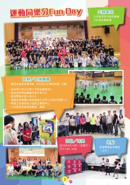 運動同樂分Fun Day 主辦單位 沙田區青年活動委員會 沙田民政事務處 協辦/合辦機構 ˙香港基督教女青年會 沙田綜合社會服務處 合辦 ˙香港聖公會沙田青少年綜合服務中心 ˙香港遊樂場協會顯徑青少年中心 ˙救世軍隆亨青少年中心 ˙循道衛理楊震社會服務處沙田青少年綜合發展中心 ˙東華三院賽馬會沙田綜合服務中心 ˙沙田區家長教師會聯會 協辦 日期/時間 地點 2016年8月14日(星期日) 下午1:30 - 6:30 香港專業教育學院 (沙田) 2