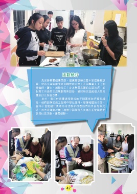 活動簡介 先安排有關健康烹飪、健康操訓練及基本家居維修訓 練,使青少年能夠有更多機會從社會上不同專業人士(如 營養師、護士、維修技工)身上學習具體的生活技巧,並 對青年自身的生涯規劃有所啟發,最終得以認識個人的興 趣並訂立長遠目標。 此外,青年於訓練課程學成的不同專業技巧和知識 後,他們能夠於義工服務中學以致用,發揮相關的才能, 當中不但能提升青年的成功感和改善他們的自我形象之 外,而且青年能於義工服務中訓練個人同理心並促進他們 參與社區活動,擴闊視野。 42