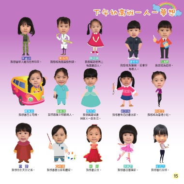 下午幼高班一人一夢想 陳書涵 陳瀚同 陳芷琳 我想當軍人維持世界和平。 我想成為服裝設計師。 我想幫助世界上 鍾栩悅 方逸晴 有需要的人。 我想成為警察,捉拿所 我想成為老師。 有壞人。 賀馨懿 姜麗嫦 賴雅微 劉語嫣 王海雯 我想當巴士司機。 我想當護士照顧病人。 我想興建城堡 我想當有名的書法家。 我想成為香港小姐。 與家人一起生活。 王 琦 文雅媛 莊 妍 謝靜怡 黃霏霏 我想住在天空之城。 我想當書法家和畫家。 我想當公主。 我想當芭蕾舞家。 我想當化妝師。 15