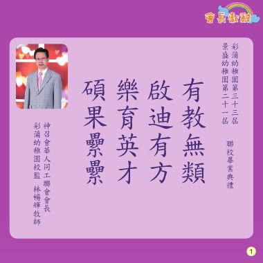 會長獻辭 景盛幼稚園第二十一屆 彩蒲幼稚園第三十三屆 碩果纍纍 樂育英才 啟迪有方 有教無類 彩蒲幼稚園 神召會華人同工聯會會長 聯校畢業典禮 校監 林暢輝牧師 1