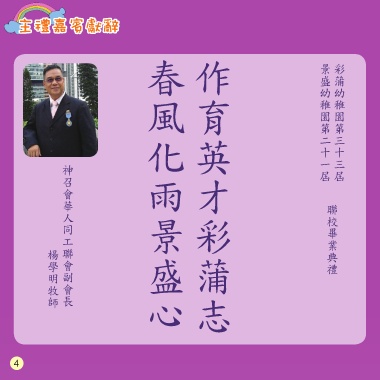 主禮嘉賓獻辭 春風化雨景盛心 作育英才彩蒲志 景盛幼稚園第二十一屆 彩蒲幼稚園第三十三屆 神召會華人同工聯會副會長 聯校畢業典禮 楊學明牧師 4