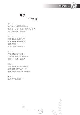 新詩創作 鞋子 1D李紀賢 每一天 我們都會穿著不同的鞋子。 有球鞋、皮鞋、涼鞋,還有很多種類, 每一對鞋都有它的特點。 球鞋, 大家都在體育課穿上它。 它每次都會慢慢的變黑, 慢慢的變老, 已經不是原本的樣子。 皮鞋, 學生搭配他穿著校服, 上班一族搭配它穿著西裝。 它給人一種高貴的氣息。 涼鞋, 它給人一種很清爽的感覺, 它跟我們平時穿的不一樣。 也會給別人一種不莊重的感覺。 鞋子, 給我們不同的感受, 155