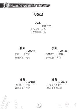 十五周年校慶標語創作比賽得獎作品 中二級 冠軍 2A陳萍萍 春風化雨十五載 努力創新迎未來 亞軍 季軍 2B黃卓怡 2B趙 敏 春風化雨育英才 孫書精神 十五載 群鷹展翅齊飛翔 春風化雨 育英才 優異 優異 2A楊梓榆 2C盧姵希 展翅高飛十五載 十五周年齊奮鬥 攜手共闖十五年 師生攜手創未來 2