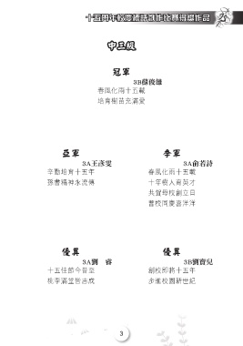十五周年校慶標語創作比賽得獎作品 中三級 冠軍 3B蘇俊雄 春風化雨十五載 培育樹苗充滿愛 亞軍 季軍 3A王彥雯 3A俞若詩 辛勤培育十五年 春風化雨十五載 孫書精神永流傳 十年樹人育英才 共賀母校創立日 普校同慶喜洋洋 優異 優異 3A劉 睿 3B劉寶兒 十五佳節今昔至 創校即將十五年 桃李滿堂皆志成 步進校園新世紀 3