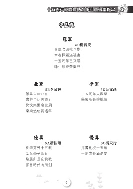 十五周年校慶標語創作比賽得獎作品 中五級 冠軍 5C楊智雯 春風吹遍桃李樹 青春揮灑滿孫書 十五周年已來臨 師生歡樂齊慶典 亞軍 季軍 5B李家輝 5D吳文彥 孫書自建已有十 十五周年人歡樂 書齡至此再添五 學展所長迎挑戰 快快樂樂度此周 樂樂悠悠賀這年 優異 優異 5A蕭佳琳 5C馮天行 桃李芬芳十五載 孫書創校十五載 莘莘學子蒸日上 一路成長滿是愛 發展所長迎挑戰 孫書時代有所創 5