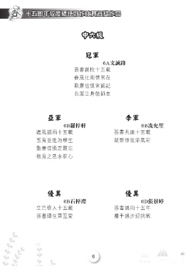 十五周年校慶標語創作比賽得獎作品 中六級 冠軍 6A文誠鋒 孫書創校十五載 春風化雨情常在 勤廉信慎常銘記 自潔立身敬師恩 亞軍 季軍 6B羅梓軒 6B冼允笙 遮風擋雨十五載 孫書共建十五載 五育並進為學生 凝聚你我添風彩 勤廉信慎定難忘 教育之恩永在心 優異 優異 6B石梓瀅 6D張景婷 立己樹人十五載 孫書邁向十五年 孫書師生齊互愛 攜手邁步迎挑戰 6
