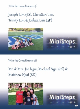 With the Compliments of: Joseph Lim (6S), Christian Lim, Trinity Lim & Joshua Lim (4P) With the Compliments of: Mr. & Mrs. Joe Ngai, Michael Ngai (6S) & Matthew Ngai (8D) 349