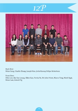 12P Back Row: Brian Sung, Charlie Zhang, Joseph Han, Jevin Kassay, Felipe Robertson Front Row: Ellen Lee, Kiu Yan Leung, Chloe Kan, Portia Yu, Mr John Priest, Marco Tong, Mark Ngai, Brian Law, Arnold Ng 124