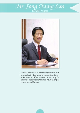 Mr Fong Chung Lun KCCIS Principal Congratulations on a delightful yearbook. It is an excellent celebration of memories. As you go forward, it offers a way of preserving the formative experiences that you will build upon for a successful future. 7