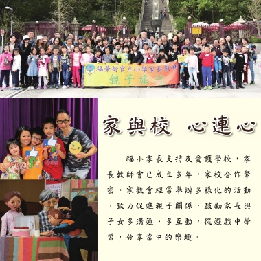 家與校 心連心 福小家長支持及愛護學校,家 長教師會已成立多年,家校合作緊 密。家教會經常舉辦多樣化的活動 ,致力促進親子關係,鼓勵家長與 子女多溝通、多互動,從遊戲中學 習,分享當中的樂趣。