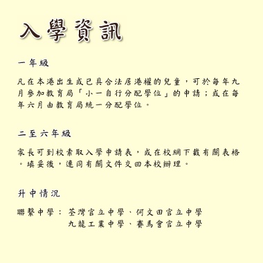 入學資訊 一年級 凡在本港出生或已具合法居港權的兒童,可於每年九 月參加教育局「小一自行分配學位」的申請;或在每 年六月由教育局統一分配學位。 二至六年級 家長可到校索取入學申請表,或在校網下載有關表格 。填妥後,連同有關文件交回本校辦理。 升中情況 聯繫中學: 荃灣官立中學、何文田官立中學 九龍工業中學、賽馬會官立中學
