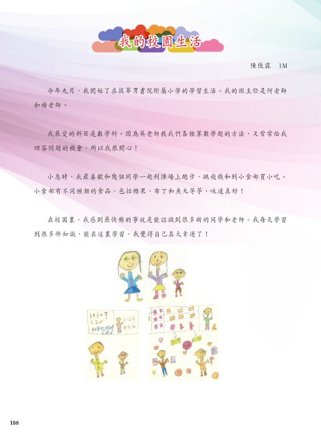 我的校園生活 陳俊霖 1M 今年九月,我開始了在拔萃男書院附屬小學的學習生活。我的班主任是何老師 和楊老師。 我最愛的科目是數學科。因為吳老師教我們各種算數學題的方法,又常常給我 回答問題的機會,所以我很開心! 小息時,我最喜歡和幾個同學一起到操場上跑步、跳飛機和到小食部買小吃。 小食部有不同種類的食品,包括糖果、布丁和魚丸等等,味道真好! 在校園裏,我感到最快樂的事就是能認識到很多新的同學和老師。我每天學習 到很多新知識,能在這裏學習,我覺得自己真太幸運了! 188