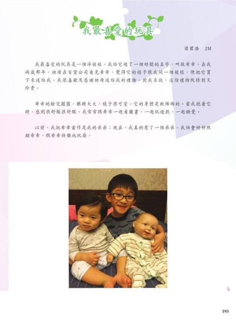 我最喜愛的玩具 梁君浩 2M 我最喜愛的玩具是一個洋娃娃。我給它起了一個好聽的名字,叫做希希。在我 兩歲那年,祖母在百貨公司看見希希,覺得它的樣子跟我同一個模樣,便把它買 下來送給我。我很喜歡及感謝祖母送給我的禮物。對我來說,這份禮物既特別又 珍貴。 希希的臉兒圓圓,眼睛大大,樣子很可愛。它的身體是軟綿綿的。當我抱着它 時,感到很舒服很舒服。我常常跟希希一起看圖書,一起玩遊戲,一起睡覺。 以前,我把希希當作是我的弟弟;現在,我真的有了一個弟弟。我倆會好好照 顧希希,跟希希快樂地玩耍。 193