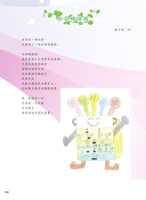衣物轉換機 唐子焯 2P 告訴你一個祕密, 我發明了一部衣物轉換機。 衣物轉換機, 還有甚麼比它更神奇和有趣? 只要站在轉換機前, 選擇性別和尺碼, 然後揀選衣服款式, 再按完成, 就能自動把新衣服穿上, 也把舊衣服存在轉換機裏。 哦,你想試一試, 沒問題,沒問題, 今天晚上, 請你悄悄來到我夢裏。 194