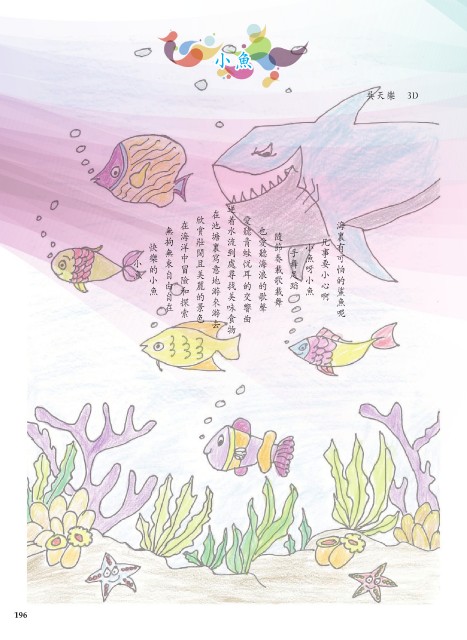 小魚 吳天樂 3D 逆着水流到處尋找美味食物 在池塘裏寫意地游來游去 無拘無束自由自在 在海洋中冒險和探索 欣賞壯闊且美麗的景色 愛聽青蛙悅耳的交響曲 也愛聽海浪的歌聲 隨節奏載歌載舞 海裏有可怕的鯊魚呢 快樂的小魚 手舞足蹈 小魚呀小魚 凡事要小心啊 小魚 196