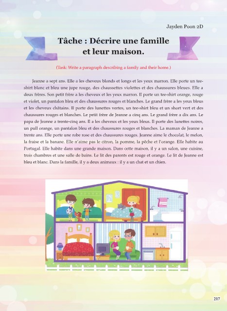 chaussures rouges et blanches. Le petit frère de Jeanne a cinq ans. Le grand frère a dix ans. Le