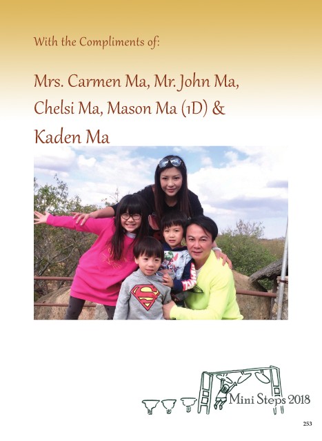 With the Compliments of: Mrs. Carmen Ma, Mr. John Ma, Chelsi Ma, Mason Ma (1D) & Kaden Ma 253