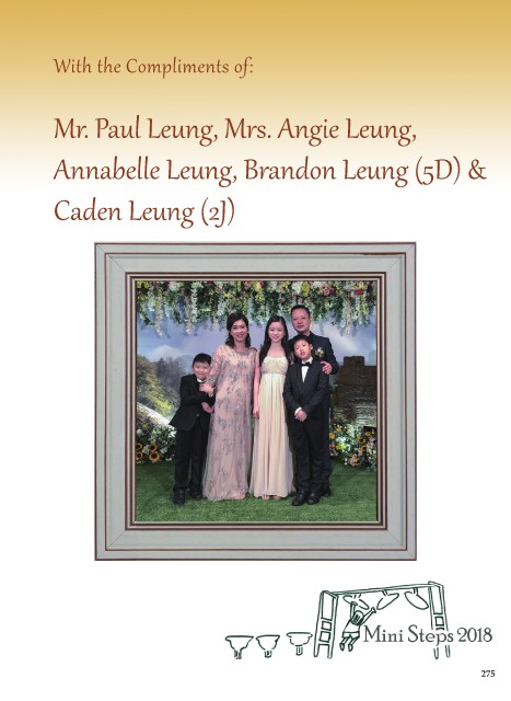 With the Compliments of: Mr. Paul Leung, Mrs. Angie Leung, Annabelle Leung, Brandon Leung (5D) & Caden Leung (2J) 275