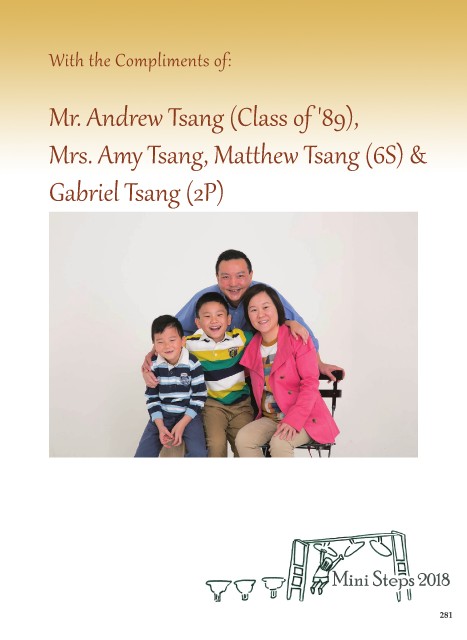 With the Compliments of: Mr. Andrew Tsang (Class of '89), Mrs. Amy Tsang, Matthew Tsang (6S) & Gabriel Tsang (2P) 281