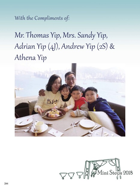 With the Compliments of: Mr. Thomas Yip, Mrs. Sandy Yip, Adrian Yip (4J), Andrew Yip (2S) & Athena Yip 284