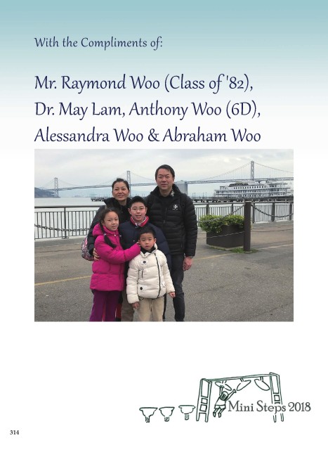 With the Compliments of: Mr. Raymond Woo (Class of '82), Dr. May Lam, Anthony Woo (6D), Alessandra Woo & Abraham Woo 314