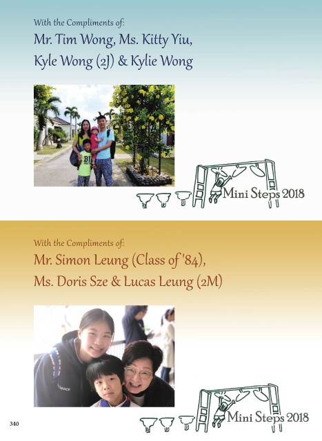 With the Compliments of: Mr. Tim Wong, Ms. Kitty Yiu, Kyle Wong (2J) & Kylie Wong With the Compliments of: Mr. Simon Leung (Class of '84), Ms. Doris Sze & Lucas Leung (2M) 340