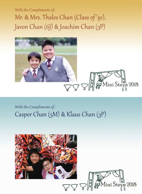 With the Compliments of: Mr. & Mrs. Thales Chan (Class of '91), Javon Chan (6J) & Joachim Chan (3P) With the Compliments of: Casper Chan (5M) & Klaus Chan (3P)