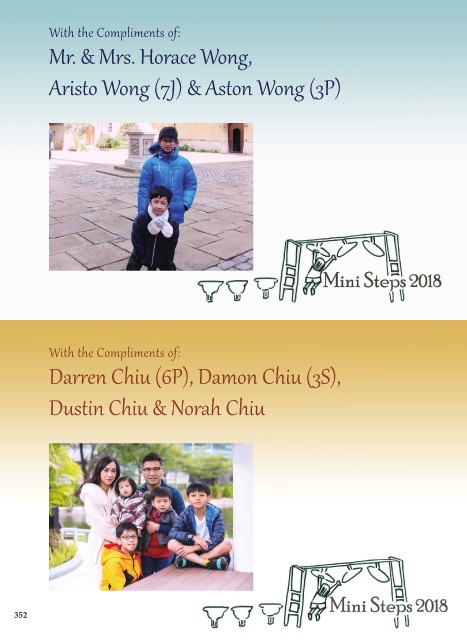 With the Compliments of: Mr. & Mrs. Horace Wong, Aristo Wong (7J) & Aston Wong (3P) With the Compliments of: Darren Chiu (6P), Damon Chiu (3S), Dustin Chiu & Norah Chiu 352