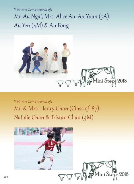 With the Compliments of: Mr. Au Ngai, Mrs. Alice Au, Au Yuan (7A), Au Yen (4M) & Au Fong With the Compliments of: Mr. & Mrs. Henry Chan (Class of '87), Natalie Chan & Tristan Chan (4M) 358
