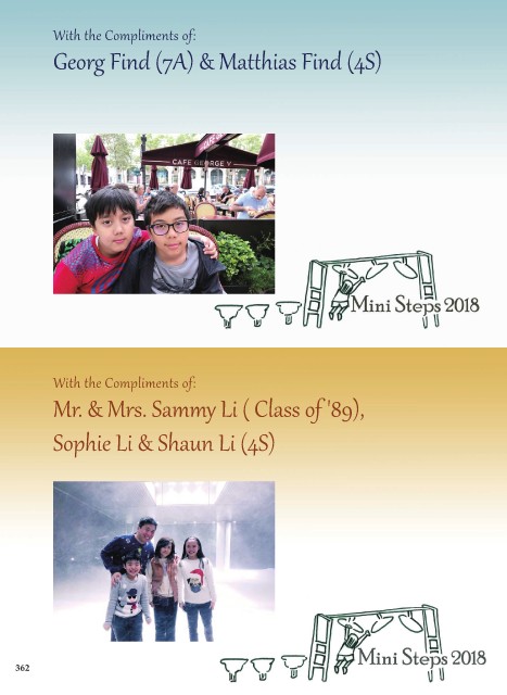 With the Compliments of: Georg Find (7A) & Matthias Find (4S) With the Compliments of: Mr. & Mrs. Sammy Li ( Class of '89), Sophie Li & Shaun Li (4S) 362
