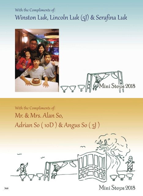 With the Compliments of: Winston Luk, Lincoln Luk (5J) & Serafina Luk With the Compliments of: Mr. & Mrs. Alan So, Adrian So ( 10D ) & Angus So ( 5J ) 368