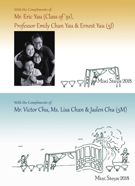 With the Compliments of: Mr. Eric Yau (Class of '91), Professor Emily Chan Yau & Ernest Yau (5J) With the Compliments of: Mr. Victor Chu, Ms. Lisa Chan & Jaden Chu (5M)