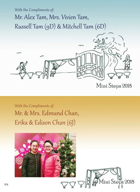 With the Compliments of: Mr. Alex Tam, Mrs. Vivien Tam, Russell Tam (9D) & Mitchell Tam (6D) With the Compliments of: Mr. & Mrs. Edmund Chan, Erika & Edison Chan (6J) 374