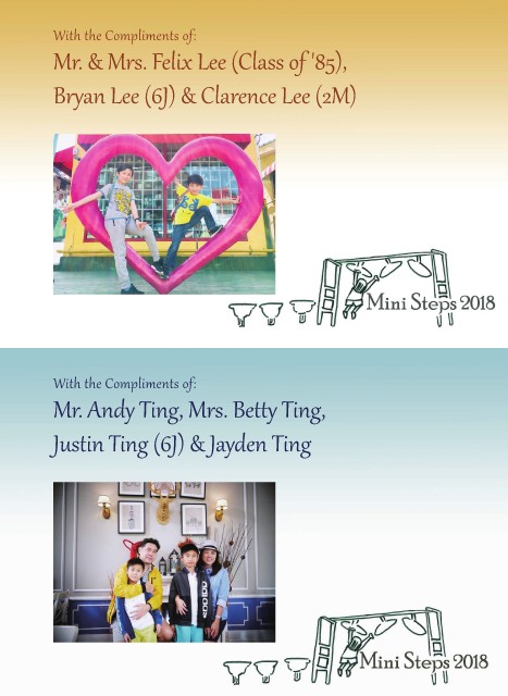 With the Compliments of: Mr. & Mrs. Felix Lee (Class of '85), Bryan Lee (6J) & Clarence Lee (2M) With the Compliments of: Mr. Andy Ting, Mrs. Betty Ting, Justin Ting (6J) & Jayden Ting
