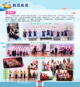 動感啟程 音樂科 在一、二年級的音樂課,安排學生學習吹奏口風琴;三至六年級學生學習吹奏木笛,希望學生從小能學習演奏一 種樂器的技巧。在三、四年級的音樂課加入粵劇基本訓練,包括身段造手、水袖、耍槍、工尺譜等。以上安排為 配合校本體藝發展,讓學生養成「一生一體藝」的高尚情操。表現優異的學生,更會被挑選成為口風琴校隊、木 笛隊、合唱團或加入樂團,讓學生有更多發揮才華的機會。 「香港好聲音」歌唱比賽 同學充滿信心在後台預備出賽 同學在台上落力演出 四至六年級歌唱比賽 聖誕音樂會 50