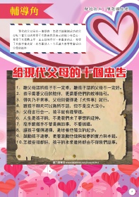 輔導角 駐校社工:陳慧嫻姑娘 現代的父母常有一個疑問:怎樣才能做個成功的父 母呢?當父母的希望子女對自我及自己的能力有信心; 希望子女喜歡上學,並主動地學習。更重要的是,希望 子女能學會去愛、去尊重別人。今天讓大家看看當成功 父母的條件: 給現代父母的十個忠告 3