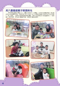 周六書叢館親子閱讀時光 學校着重推廣親子閱讀文化,鼓勵家長和孩子一起閱讀,引發孩子的閱讀興趣,進而養 成學生主動閱讀的習慣。學校於周六早上9時至12時15分開放書叢館予家長及其子女在校進 行「親子閱讀」,他們除可閱讀書叢館裏的圖書,還可以借用學校的平板電腦與孩子一起閱 讀英文電子圖書,享受親子閱讀的樂趣,增進親子關係和感情。 43