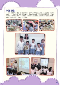 伴讀計劃 為了培養學生多閱讀、愛閱讀的習慣,由高年級學生擔任的伴讀大使逢星期四午膳時段 會陪伴一、二年級同學一起閱讀中文圖書,分享閱讀的樂趣,彼此交換閱讀的心得。伴讀計 劃深受低年級同學的歡迎。下學期邀請了家長義工擔任故事姨姨到校為低年級學生講故事, 透過故事姨姨的分享,激勵學生多元閱讀。 低年級同學喜歡跟伴讀大使一起閱讀圖書。 聽完故事,答對問題的同學,故事姨姨會給小禮物以作獎勵。 同學們都聚精會神地聽故事姨姨講故事。 44