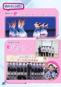 校外比賽成績 體藝比賽 「第五十四屆學校舞蹈節」舞蹈比賽—中國舞(群舞)優等獎 服務項目比賽 香港紅十字會青年團— 傑出青年團比賽冠軍(東區)、 友誼活動創作比賽亞軍(港島總部)、 青年護理比賽最佳隊長(東區) 5