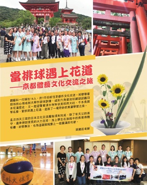 15 當排球遇上花道 ——京都體藝文化交流之旅 體藝科一行師生18人,於7月份前往京都作文化交流。同學帶著 期待的心情或到大學作排球訓練、或到六角堂池坊總部認識日 本花道歷史,又一起遊覽著清水寺和伏見稻荷大社、千本鳥居 等名勝,當排球遇上花道,造就了一場奇妙的東瀛學習之旅。 是次四天三夜的日本文化交流團能順利完成,除了有天父的保 守,還幸得到家長的大力支持;加上學生在旅程中的表現得體 有禮、好學專注,也為這趟旅程劃上一個圓滿的句號。 梁麗莊老師