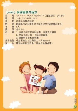 (4/4)家庭管教方程式 日 期 :2/5、9/5、16/5、23/5/2018(逢星期三,共4節) 時 間 :上午10:00-中午12:00 地 點 :本中心四樓活動室 對 象 :觀塘區內新來港不足七年的6至12歲兒童之家長 名 額 :8人 費 用 :每位$10 內 容 :1. 透過介紹不同互動遊戲,促進親子關係 2. 家長互相分享,了解兒童需要 3. 學習與子女和諧相處 負責職員:楊淦熙先生(註冊社工,內線110) 備 註 :服務如非指定對象,需先作後備處理。 11