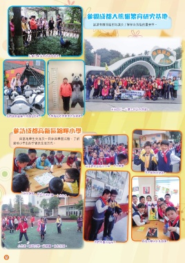 參觀成都大熊貓繁育研究基地 認識有關熊貓的知識及了解保育熊貓的重要性。 這隻孔雀前來歡迎我們呢! 來到四川一定要去探訪大熊貓。 我們跟熊貓模型來個合照吧! 大熊貓站起來原來也很高呢! 參訪成都高新區錦暉小學 與當地學生交流及一同參與學習活動,了解 當地小學生的學習及生活方式。 同學們參訪四川小學,十分興奮。 我們做個好朋友。 上語文課時,彼此交流討論,十分投入。 兩地同學合作的成果。 我們來個自拍吧! 小息時,兩地同學一起跳繩,合作無間。 3