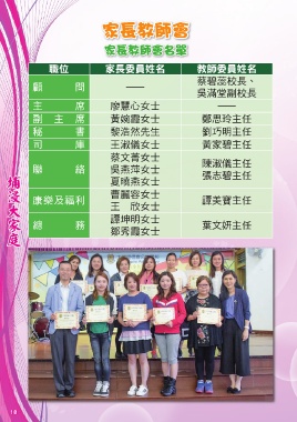 家長教師會 家長教師會名單 職位 家長委員姓名 教師委員姓名 蔡碧蕊校長、 顧 問 — 吳滿堂副校長 主 席 廖慧心女士 — 副 主 席 黃婉霞女士 鄭思玲主任 秘 書 黎浩然先生 劉巧明主任 司 庫 王淑儀女士 黃家碧主任 蔡文菁女士 聯 絡 吳燕萍女士 陳淑儀主任 張志碧主任 夏曉燕女士 曹麗容女士 康樂及福利 譚美寶主任 王 欣女士 譚坤明女士 總 務 葉文妍主任 鄒秀霞女士 18