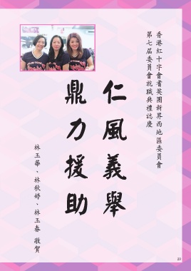 第 香港紅十字會耆英團 七 屆委員會就職典禮誌慶 鼎力援助 仁風義舉 新界西 地區委員會 林玉華、林秋婷、林玉春 敬賀 29