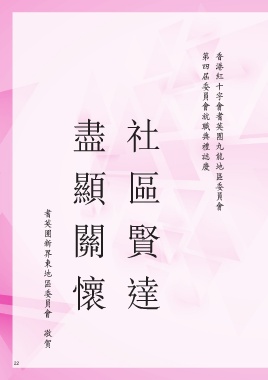 第四屆委員會就職典禮誌慶 香港紅十字會耆英團九龍地區委員會 盡顯關懷 社區賢達 耆英團新界東地區委員會 敬賀 22